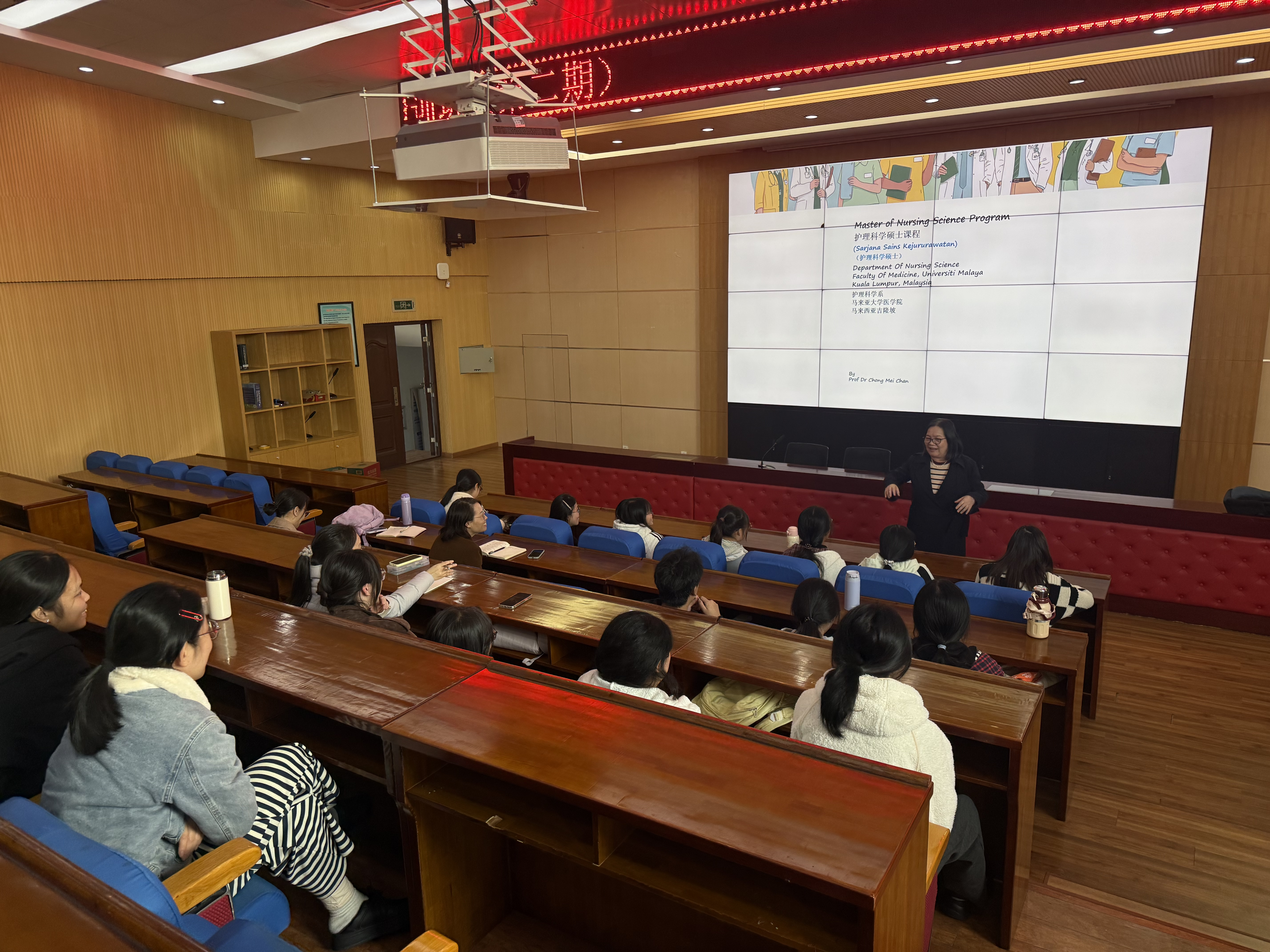 12 月 8 日至 11 日,马来亚大学护理学院知名学者、教授张美珍应邀来校为学校护理专业骨干教师、本科学生及附属医院护理骨干带来四场内容翔实、视野开阔的专题讲座。讲座主要围绕护理本科人才培养体系构建、临床科研能力提升、国际校际合作深化及院院融通实践创新四大核心主题。