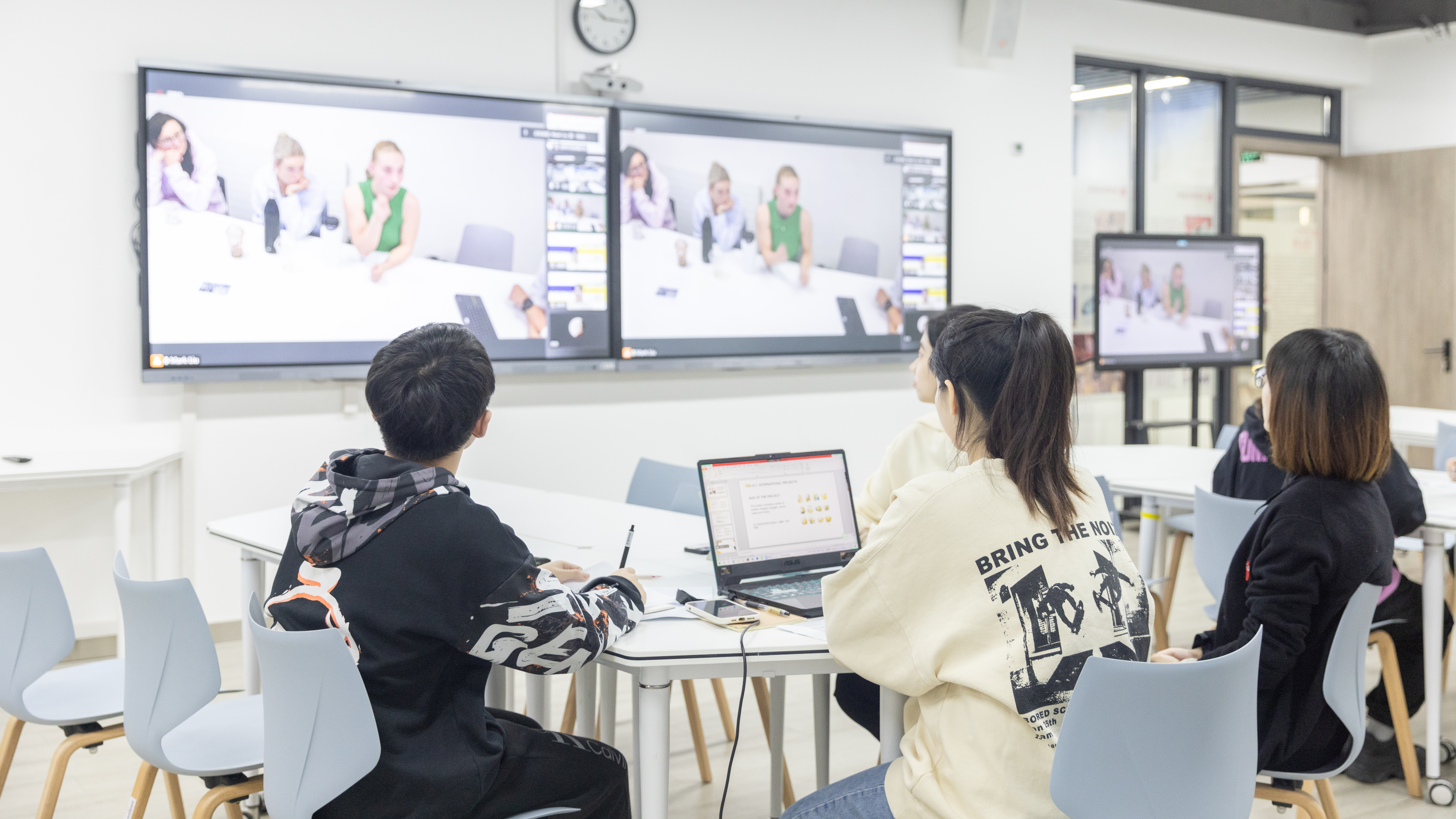 在第二现场,副校长陈海荣,怀卡托国际学院领导班子成员、艺术设计专业师生进行观摩聆听。陈海荣表示,“艺术”在插上“科技”的翅膀之后,通过“空中工作坊”让中新师生可以实现共备、共上、共评一堂课,真正实现了跨越国界、时差、语言共享教学资源,为高职中外合作办学特色办学提供可借鉴的范例。此外,中新双方学生也表示参加“空中工作坊”,真正激发了他们自身的学习动力,在不同国籍、不同文化背景的同学间交流萌生了更多的创意。