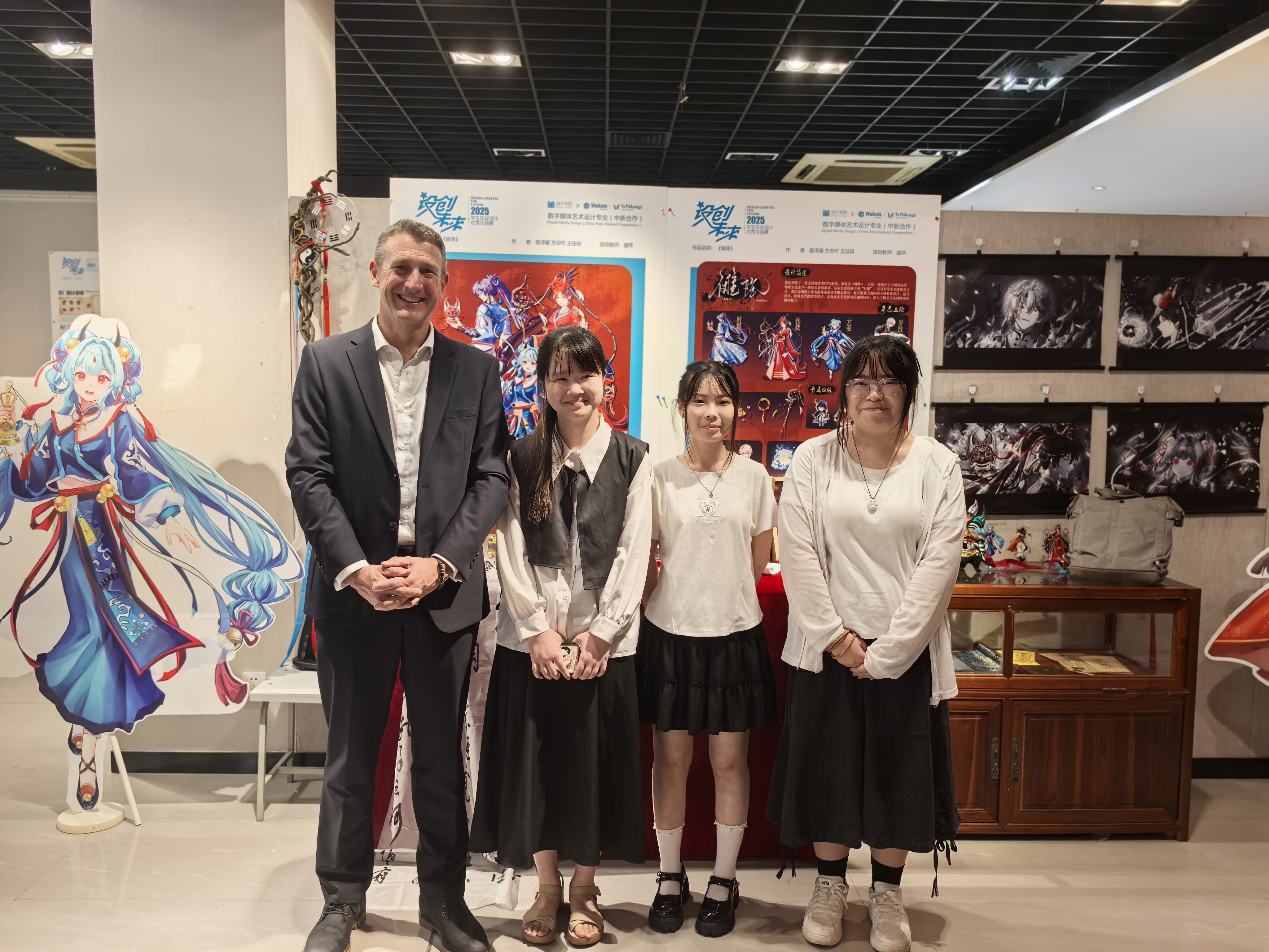 典礼结束后,皮茨一行参观了设计学院2025届“设创未来”毕业设计展。他对中新合作项目学生的作品给予了高度评价,称赞其“展现了跨文化设计思维的突破性与技术应用的创新性”。